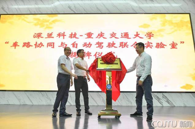 Yang Qiu, Secretary of theCPCCommittee at the School of Mechanical, Electrical and Vehicle Engineering, YangJianxi, Vice President of the School of Information Science and Engineering,and Feng Cheng, General Manager of DeepBlue AI (Chongqing), jointly unveiledthe sign-board of "Joint Laboratory for Vehicle-Road Collaboration andAutomatic Driving"